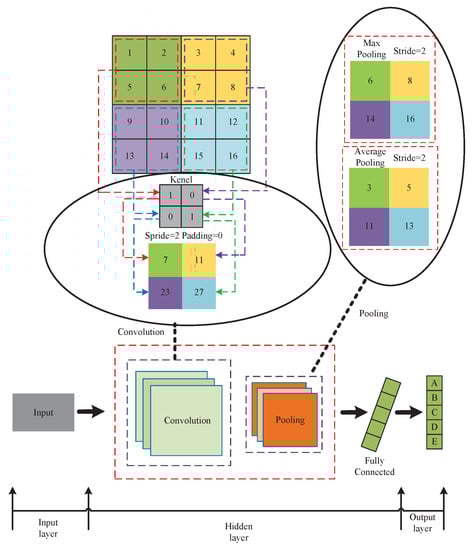 CNNs have made significant breakthroughs in recent years, benefiting from the rapid development of deep learning and artificial neural networks, as well as massive advancements in computing hardware and data storage technologies []. CNNs can automatically adjust the weights between neurons and have the advantage of non-linear mapping []. CNNs are end-to-end processing mechanisms that usually include a convolutional layer, a pooling layer, and a fully connected layer []. Figure 1 depicts the structure of a CNN.