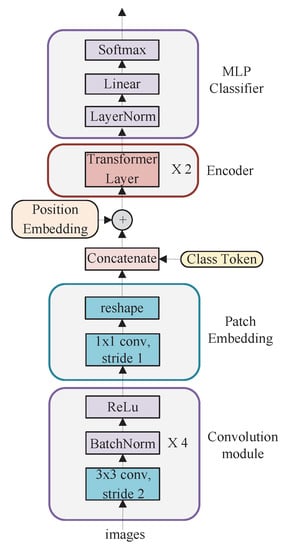 Vision Transformer (ViT) [] is the first to apply a pure Transformer architecture to image classification and achieves results comparable to CNN. ViT consists of three main basic modules, patch embedding, encoder, and multilayer perceptron (MLP) classifier. The patch embedding consists of conv2d (16 × 16, stride = 16) and reshape. Multiple vertically stacked Transformer layers form an encoder. The MLP classifier comprises layer normalization and fully connected layers. In the actual execution process, the ViT network first divides the input image (224 × 224 pixels) into 16x16 pixels of non-overlapping patches through patch embedding, reshapes each patch into a one-dimensional token, then concatenates these tokens and a classification token (plus position embedding) is fed to the encoder for encoding, and finally sent to the MLP Classifier for category prediction.