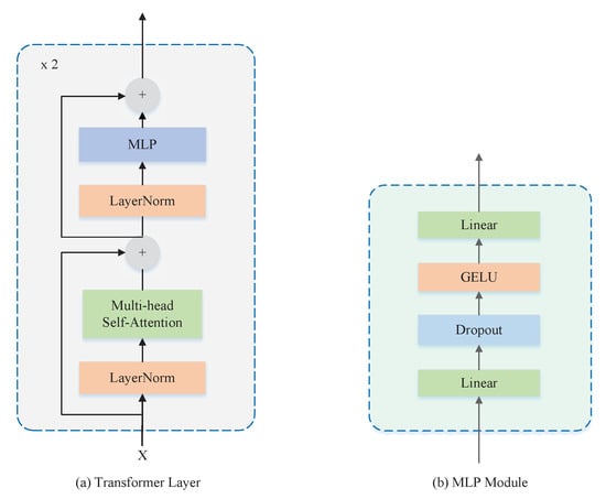 The encoder involves two vertically stacked Transformer layers. As shown in Figure 3a, each Transformer layer consists of two sub-layers. The first sub-layer structure consists of LayerNorm, residual structure, and multi-head self-attention (MHSA). The MHSA number used in this paper is four, and the internal Scaled Dot-Product Attention scoring mechanism has been adopted in MHSA. The second sub-layer structure consists of LayerNorm, Multilayer Perceptron (MLP), and residual structure. The MLP is shown in Figure 3b, which consists of the fully connected layers, the dropout, and the Gaussian Error Linear Units (GELU) activation function superimposed.