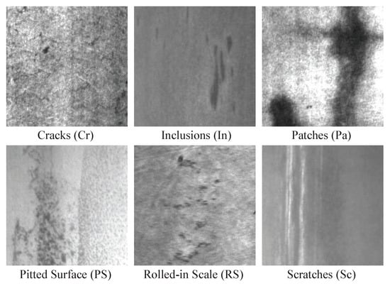 This paper takes the NEU-CLS dataset collected by Northeastern University as the subject of study. It has been extensively studied in machine vision and experimental results show that datasets have a significant impact on experimental results []. The NEU-CLS dataset contains 1800 grayscale images of hot rolled strips of steel surface defects, each with a size of 200 × 200. There are six categories of defects in this dataset, which are cracks (Cr), inclusions (In), patches (Pa), pitted surface (PS), rolled-in scale (RS), and scratches (Sc) []. Sample images from the NEU-CLS dataset are shown in Figure 5.