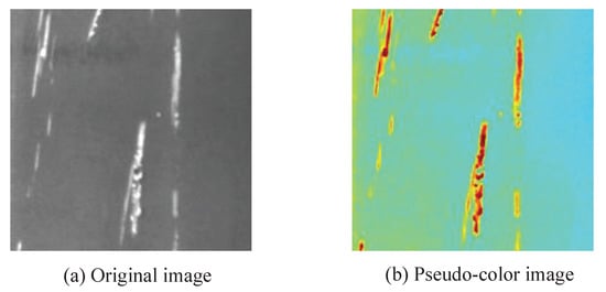 Pseudo-color enhancement is a technology that transforms different grades of grayscale images into various color images according to a linear or nonlinear mapping function. The JET color mapping algorithm is the most commonly used in computer vision, which maps the gray image (0–255) into the pseudo-color image, as shown in Figure 6. The JET mapping algorithm produces pseudo-color images with a high contrast ratio and enhances the information content of the image, which can improve the visual effect of the sample images, effectively highlight the details of the image, and extract features from the sample image [].