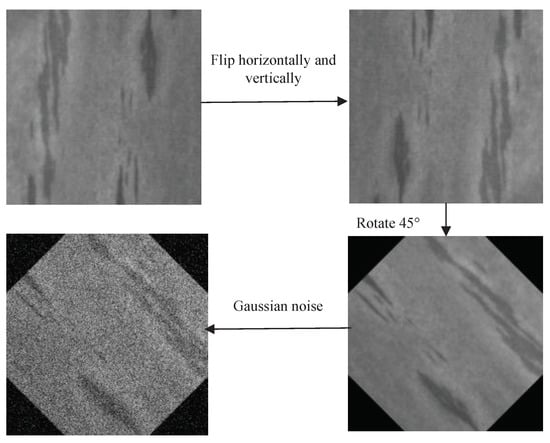 We divide the NEU-CLS dataset into a training set and a test set. Data-driven deep learning models require large samples of training samples []. Therefore, we utilize several data augmentation strategies such as Gaussian noise and geometric transformation to expand the training samples to prevent overfitting during model training. Finally, we scale all images to a uniform size of 224 × 224 pixels using bilinear interpolation. Figure 7 introduces the details of the data augmentation.