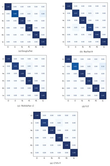 Confusion matrix of models. (a) GoogLeNet, (b) ResNet18, (c) MobileNet v2, (d) ViT, (e) CNN-T.