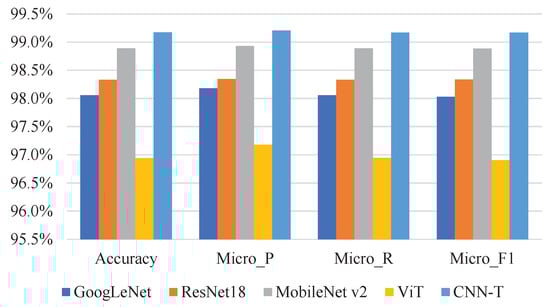 The accuracy, precision, recall, and F1 of CNN-T and other methods at a training rate of 70% are shown in Table 1. As shown in Table 1, all the models are above 95% accuracy. Both CNN-T and MobileNet v2 achieved a classification accuracy of 98.33%, but the accuracy of CNN-T was 0.03% higher than that of MobileNet v2. The ViT based on a pure Transformer encoder achieved the worst performance.