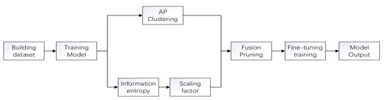 In order to achieve the most refined and simplified network model structure, the fusion pruning method combines two pruning methods, filter clustering and information entropy hierarchy, to remove the redundant filters and channels. On the one hand, the redundant filters are searched for from the filter perspective. On the other hand, based on the information entropy hierarchy, the importance between each layer is judged from the layer perspective to determine the pruning rate of each layer, and then channel pruning is performed to remove the redundant channels.