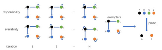 Affinity Propagation (AP) was originally proposed as a paradigm for selecting data points with different attributes. All samples are considered as nodes in the network, and then the clustering center of each sample is calculated based on the message transmission of each edge in the network. There are two kinds of messages passed among the nodes during clustering, which are responsibility and availability. Affinity Propagation algorithm [38] continuously updates the responsibility and availability values of each point through an iterative process until high-quality exemplars (similar to the center of mass) are produced, while the remaining data points are assigned to the corresponding clusters.