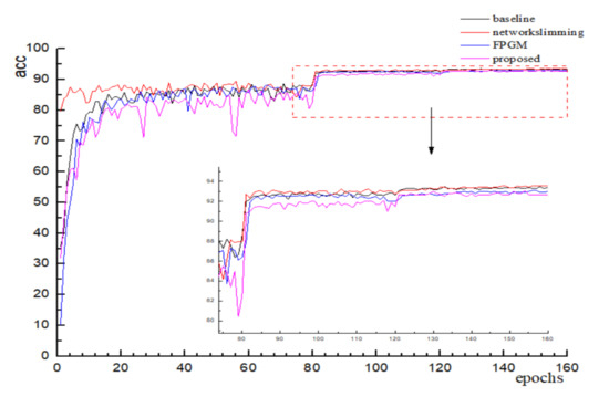 VGGNet-16. After pruning and fine-tuning, several different algorithms’ accuracy variation is shown in Figure 5 below, and it can be found that the final convergence values do not differ much. The accuracy of the proposed pruning method did not lose much accuracy compared to the other algorithms, which is in accordance with the experimental expectations. As shown in Table 1 below, it can be found that the FPGM uses a geometric center-based filter evaluation metric with a small difference in accuracy, but only 34.22% reduction in floating point computation. The literature [25] reduces half of the computation by sparsifying the scale factor evaluation and reduces the parameter volume to 1.83 M. Compared with other algorithms, the algorithm in this paper prunes from both filter and channel perspectives, which greatly compresses the number of parameters as well as the computation volume while ensuring that the pruning accuracy remains basically the same, and achieves the purpose of streamlining and accelerating the network model.