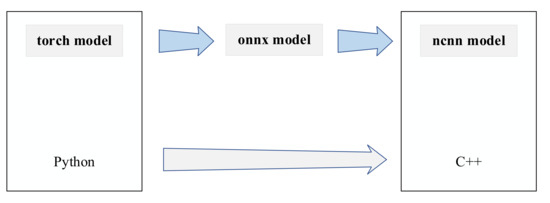 The algorithm in this paper will get the model file and weight file after design and training in the Pytorch framework, but NCNN does not provide the interface to convert the Pytorch model to NCNN model directly. NCNN provides interfaces for conversion of caffe framework and onnx model formats, but the caffe framework does not provide interfaces for model conversion from Pytorch to caffe. Therefore, in this paper, we choose to convert the model from torch to the intermediate format onnx first, and then from onnx format to NCNN model, and verify the results at each conversion format. Finally, we can get the model parameter files and model weight files in NCNN format. The model conversion process is shown in Figure 7.