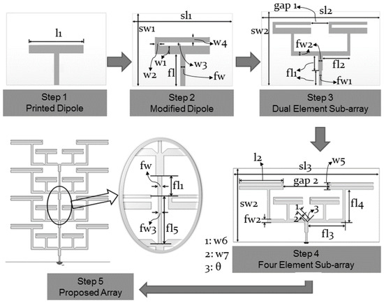 The design flow in Figure 2 shows five distinct steps in which a one wavelength dipole antenna is transformed into the proposed array. The target is to achieve a frequency bandwidth of more than 7 GHz with gain of more than 11 dB and efficiency of more than 80%. The design flow starts with the design of a simple dipole antenna printed on Rogers RT5880 laminate. The dipole is then transformed into a modified and folded dipole configuration to increase the gain and the frequency bandwidth. The antenna design is further progressed to step 3 in which a dual element sub-array design is presented which gives better gain and bandwidth than the previous step. The design is further improved in step 4 and step 5 to achieve the desired bandwidth, gain and efficiency performances. A comparison between different configurations of the design flow is shown in Table 2.
