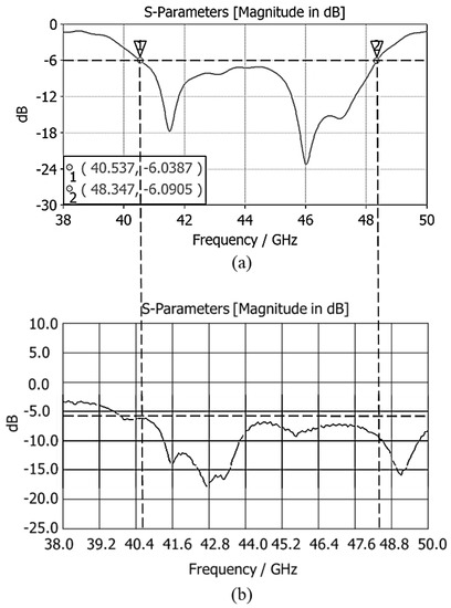 The simulated and tested S-parameters S11 of the proposed array antenna are shown in Figure 3. It can be seen from Figure 3a that the antenna is resonating with a large 6 dB frequency bandwidth ranging from 40.5–48.3 GHz. The antenna is thus capable of covering 40.5 GHz to 42.5 GHz, 42.5 GHz to 43.5 GHz, 45.5 GHz to 47 GHz and 47 GHz to 47.2 GHz 5G bands as recommended in WRC-15 [33]. The tested S-parameters of the antenna are obtained by connecting it to a calibrated vector network analyzer and the graph is presented in Figure 3b. The measured bandwidth ranges from 40.7 GHz to greater than 50 GHz, thus covering the aforesaid 5G bands of communication.