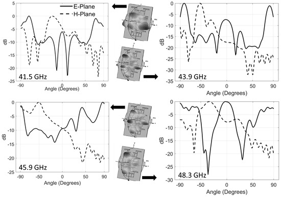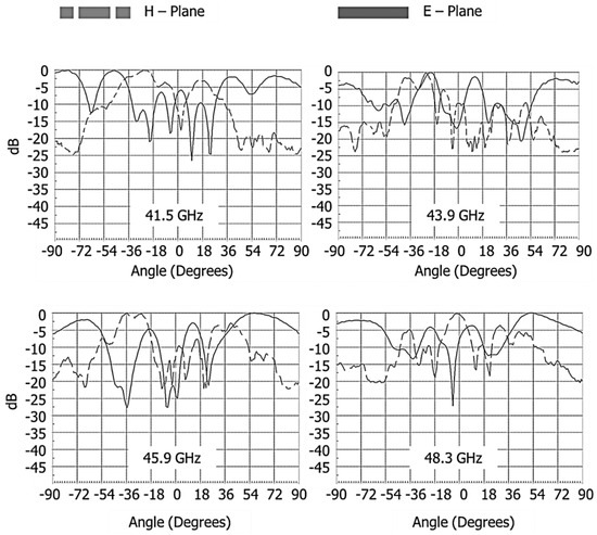 The simulated 2D and 3D radiation pattern of the proposed array antenna at different frequencies is shown in Figure 4. It can be seen that the radiation pattern is directional and the peak radiation lies perpendicular to the plane of the array, thus making it a broadside array. The radiation pattern of the proposed array antenna after testing is shown in Figure 5. The measured radiation patterns were extracted from an anechoic chamber as 2D Cartesian plots. It can be seen from the E-plane and H-plane radiation patterns that the array possesses a fairly directional radiation pattern. Moreover, the testing results approximately match with the simulation results, making the design more realizable in practice.