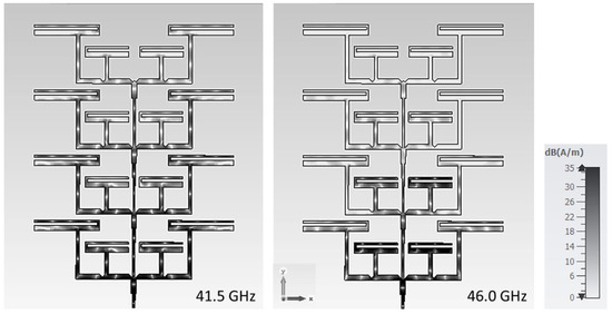 The simulated surface current distribution of the proposed array antenna is shown in Figure 6. It can be seen that the lower rows of the array contribute more towards the radiation as compared to the upper rows at both frequencies of observation. The upper elements of the antenna array make the radiation pattern directional, thus contributing more towards the enhancement of the antenna’s directivity and gain.