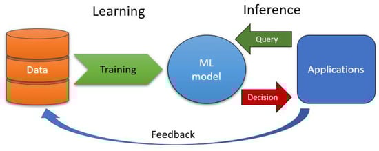 ML’s primary concept is to create autonomous systems that learn from data throughput by identifying patterns and making decisions based on results [21]. The learning process and its implementation are illustrated in Figure 1.