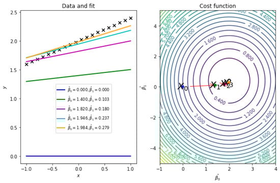 Where k is the number of iterations, is the gradient of the dependent variable, and is the independent variable. The gradient descent iterative action is shown in Figure 2. According to Equation (1), there are two coefficients as and presented as contour levels. The starting point of gradient descent, , moves to , then from to , until it converges to the optimum value. The ideal optimum value is the middle of the circles, which indicates the global minimum. Figure 3 also shows the local minimum, which may cause deceptive predictions. Gradient descent does an iterative update to find the best coefficients leading the global minimum.