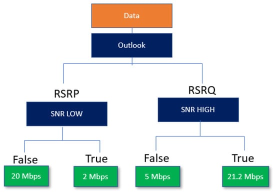 DTR is a prediction model based on recursive partitioning of features into a tree-like structure. It is like a hierarchical flowchart with internal nodes, and every node has an attribute to test and classify an outcome. Based on probability, the nodes are assigned to a related class. Thus, even slight variations may end up with different DTs [32]. Figure 3 shows a flowchart representation of DTs. According to the flowchart, the data stream goes through the outlook and checks the RSRP and RSRQ classes. If the class comprises low SNR, then it picks RSRP, else, it picks RSRQ. If RSRP and RSRQ branches determine the throughput under or over the predefined threshold, then it makes a decision accordingly.