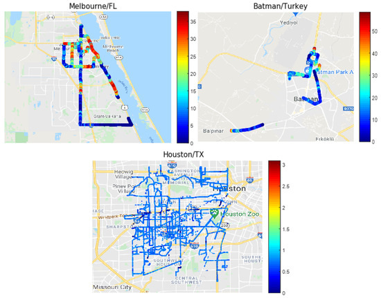 Three data sets from different locations (Melbourne, Florida, Batman, Turkey, Houston, Texas) with varying natural characteristics were collected and tested to validate this endeavor’s accuracy. Geographical visualization of the data sets is illustrated in Figure 5 with the UL throughput heat maps. Melbourne and Batman data sets were collected under similar and stable weather conditions and with the same UE velocity. However, we do not know under what conditions the Houston data set was collected since one of the major US cellular companies provided these data. The first test data were collected from the Melbourne, FL, area with suburban nature characteristics. RantCell Test Analytics measurement application is installed on a Samsung Note 10 (SM-N9750/u) smartphone, and all tests were conducted with that device in this area. The data collection part took ten days (from 14 to 25 September) under mostly similar weather conditions. The weekdays at different periods were chosen for receiving realistic results. The data collection was performed in the same paths each day to reduce the number of active users’ effect on UL data rates. The average car speed was 40 mph, and the testing and equipment configuration was frequently checked. We followed the same configurations and procedures in the second data collection. The second data set was gathered from Batman, Turkey, which has an urban nature characteristic from 5 to 16 October. A cellular network company provided the last data set collected in Houston, Texas, where metropolitan nature characteristics dominate. The operator data were collected between 31 March and 13 April. The following key performance parameters were trained in the machine learning algorithms to predict UL throughput prediction: