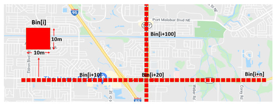Data binning is a frequently used technique for minimizing minor measurement errors. This preprocessing procedure places data sequences into small clusters called bins, therefore, measurement fluctuations are decreased with the cost of resolution reduction. Data binning provides extra advantages by reducing the effect of car velocity in traffic. Since RF scanners gather a fixed amount of measurements in a period and predefined route, the number of the measurements decreases as the test car speeds up and proportionally increases as the car slows down or stops. Capturing more data points in some geographical areas, especially near traffic signs, affects ML algorithms and causes higher prediction errors. In this study, the geographical areas where the measured data set is divided into 10 m × 10 m bins after the feature extraction, and each bin exhibits the average values of the data features and parameters. Figure 6 shows how the data binning technique was applied for the drive testing scenario. The average RSRP and UL throughput values are assigned to , which indicates the bin value. Equation 10 shows the computation of [36].