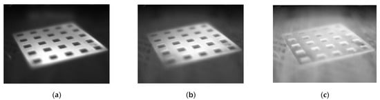 A common visual measurement system used in industry is the eye-in-hand inspection system []. The camera is mounted at the end of a robot arm and scans the detected objects. The eye-in-hand inspection system should be calibrated before measurement. The calibration results are used to establish the corresponding relationship between the detected target and its image. For a visual measurement system based on a visible-spectrum camera, we can calibrate the system by the camera’s intrinsic parameters calibration and eye-in-hand calibration, which can acquire the relationship between the camera frame and the robot’s end frame []. However, for a visual measurement system based on a thermal-infrared camera, the method above is not feasible. On the one hand, the thermal infrared camera is unable to capture the calibration patterns of the visible-spectrum camera []. On the other hand, even if a calibration pattern with temperature difference is used, the thermal diffusion of the infrared image will cause blurring of the image and make it difficult to acquire calibration features. Figure 1a–c show the calibration board with temperature difference taken continuously by the thermal infrared camera, which can clearly show the phenomenon of thermal diffusion. The edges of the calibration pattern are not clear and become increasingly blurred.