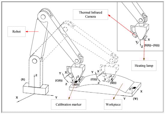 To facilitate modeling of the thermal-infrared visual measurement system, coordinate frames were established, as shown in Figure 3. The workpiece coordinate system is denoted as {W}, the robot coordinate frame is {R}, the camera coordinate frame is {C}, and the end of the robot arm coordinate frame is {E}. A reference coordinate frame {S} is established, which is associated with {E}. Coordinate frames at time t are denoted as {C(t)}, {E(t)}, and {S(t)}.