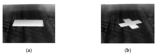 where m′ = m/m34. Now, there are eight parameters in Equation (12). Four control points are enough for solving all of them, as long as any three of them are not located on the same line. Using more control points can optimize the results. The calibration target can be designed like Figure 4a or Figure 4b. The edges of the calibration target in its thermal image can be detected, and the intersections of the detected edges are used as the control points.