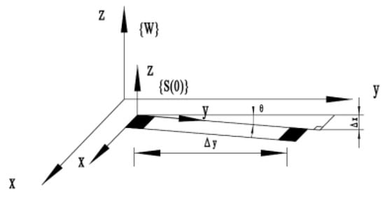 The system parameter WTS(0) is the transform matrix between {S(0)} and {W}.The coordinate frame {S(0)} is established on the calibration target, as shown in Figure 5. The origin of {S(0)} is a corner point of the rectangular calibration target. The x-axis and the y-axis are the sides of the calibration target. The vertical direction of the calibration target is the z-axis. The calibration target is placed on the x-y surface of the {W}. Since the calibration target is thin enough, it can be considered that the x-y surfaces of {W} and {S(0)} are on the same plane. There are only three independent variables in the transform matrix WTS(0), including two translation variables and one rotation variable. It can be described as: