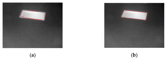 Figure 6 shows the improvement of the proposed sideline extraction method compared with the traditional one. The red lines mark the extraction results. We can see that the traditional method of directly using an edge detector extracts multiple small line segments at the edge of the calibration target, as the edges are too blurred. Meanwhile, the line segments extracted by our method are accurate. After the sidelines are extracted, the calibration points are obtained by their intersections.