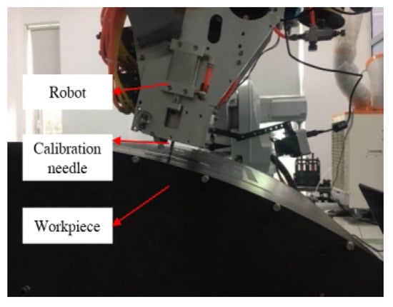 Positions were measured by the proposed method several times. The measurement results were compared with those measured by the robot’s calibration needle. For all of the points to be measured, we denoted them as A1~A3. The robot’s calibration needle was set on the measured points, as shown in Figure 8. The robot system would obtain their coordinates in {W}. Then, these points were measured with the proposed infrared visual system. The measured results are all shown in Table 2.