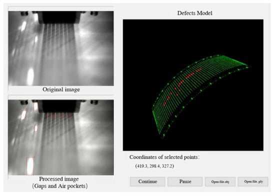 The root mean square errors (RMSE) were calculated as 0.225 mm, 0.185 mm, and 0.044 mm. Table 3 shows the measurement results of these three methods. The accuracy of the proposed method in this paper was improved compared to the other two methods. Paper [] uses the infrared visual measurement system calibrated by this method to measure the defects in the online inspection of automated fiber placement. Figure 10 shows the human-computer interaction interface. The conditions of the composite placement experiment are set as follows: environment temperature 19 °C, environment humidity 40.5%, lay-up surface temperature 26 °C, heating lamp power 73%, compaction pressure 0.3 Mpa, and laying speed 150 mm/s. Defects such as gaps, foreign bodies, and air pockets are detected. By extracting the edges and calculating the pixel coordinate of defects, the position of defects can be achieved in the workpiece coordinate frame according to calibration results. The left side of the interface shows the original image captured by the thermal-infrared camera and the defects detected in real-time. The right side of the interface shows the location and dimensional information of the defects marked onto the workpiece model, forming a 3D defect model for industrial HMI. Through the human-computer interaction, the defect model can be manipulated with the mouse and click to select the defect of interest. The selected defect displays its position information on the interface; here, the information was (319.3, 298.4, 327.2). The results illustrate that the proposed method achieved good performance in practical applications.