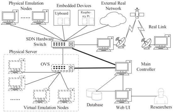 Corresponding to the platform architecture, a typically physical implementation model is presented, which has four principal parts: the Web UI, main controller, emulation node and SDN switch, as shown in Figure 2.