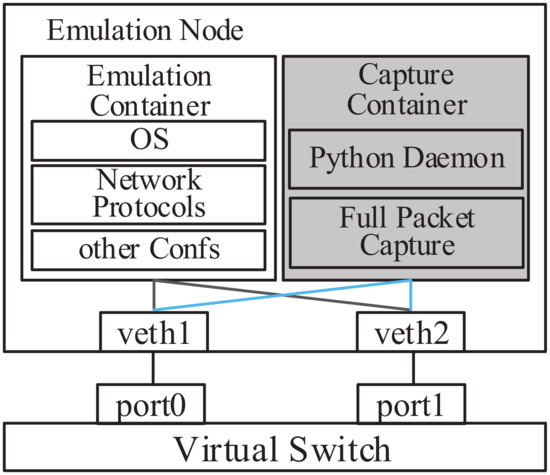 As shown in Figure 3, an emulation node is a Pod which comprises an emulation container and a capture container. Network protocols or technologies which need to be validated are deployed at the emulation container. The capture container is responsible for real-time network measurement and full packets capture in simulation scenarios. Considering changeable simulation scenarios and different networks, researchers need to set network measurement points as needed. Via binding to each other in the form of Pods and sharing network resources, the capture container can measure and monitor all network information of the emulation container. Thus, the flexible configuration of network measurement on demand is realized.