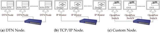 An emulation container is created based on container images. The network protocol implementation software and other applications would be deployed among the container image in advance. According to different types of network protocol architecture, the emulation container can be divided into three types, namely the DTN node, TCP/IP node and custom node, as shown in Figure 4. The DTN node and TCP/IP node correspond to DTN and the TCP/IP network protocol architecture, respectively. Furthermore, custom node provides an extension method for new or modified protocol architectures in the proposed platform.