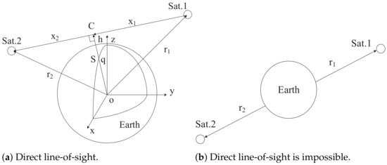 The visibility function defined by Equation (5) can be used to predict explicitly whether satellites are visible to one another or not. The sign of associated with visibility can be obtained by constructing a case in which direct line-of-sight visibility is impossible, as shown in Figure 5b. For this case we have: