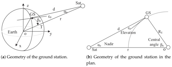 In the space–terrestrial link, the mutual visibility is defined as the direct line of sight between a space platform and a ground-based node at a certain time. Considering the geometry defined in Figure 6, in which a satellite and ground station are visible to each other. The two points represent the satellite (Sat) and ground station (GS), and then the third is the Earth’s center. The subsatellite point is indicated by T, which is the point where the joining line of the satellite and Earth’s center intersect the Earth’s surface. Distance d represents slant range between a satellite and ground station. This range changes over time since the satellite flies too fast above the ground station. In Figure 6a, the radius r is: