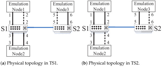 The data plane serves to emulate network scenarios directly, and contains SDN switches, servers, emulation nodes, etc. These underlying network resources are connected with each other in a hierarchical star network structure. Emulation nodes are connected to the virtual switch on the server and represent SN nodes at the logical plane. Diverse software and applications are installed in the emulation node. Servers and external devices or networks are linked to each other by the SDN hardware switch.