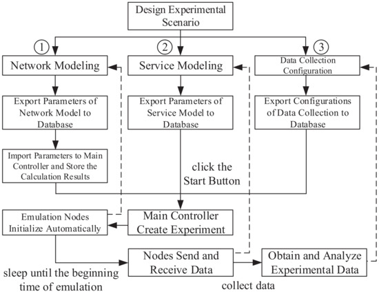 Typical network experimental validation approaches include simulation, a live testbed, and emulation. Discrete-event network simulation has enough flexibility, e.g., ns-2 [15] and OPNET [16]. However, the network simulation has no real network traffic and is hard to realize the real description of complex SN equipment and its environment through the abstraction of various environmental parameters. An actual hardware-based testbed has the highest emulation authenticity, e.g., ORBIT [17], UMass DieselNet [18]. However, for the high cost and poor extendibility of SN nodes, it is difficult for the testbed to support the requirements of changeable SN emulation scenarios.