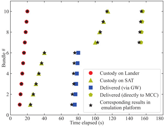 In the above scenario, ten bundles of 50 kB were transferred from the Moon Lander to the MCC. As illustrated in Figure 13, ten bundles were first generated and taken into custody on the Lander. Upon the first Lander-Sat contact started at 20 s, therefore six bundles were transferred and taken into custody at the Moon Sat. Then these six bundles were delivered to GW when the Sat-GW contact was on at 70 s. As the GW-MCC link was continuous, these data were immediately transferred to the MCC. The remaining four bundles were transferred to Sat during the second Lander-Sat contact, working at 100 s, and taken into custody as before.Finally, when the Sat-MCC contact first opened at 150 s, they were directly delivered to MCC according to CGR. The comparison of obtained experimental results between [33] and our study indicates the reliability of the proposed platform.