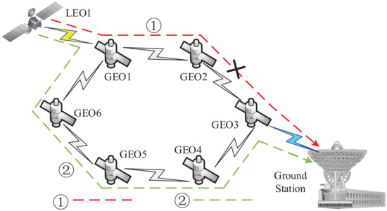 The routing convergence process, caused by links variation, makes OSPF routing unstable. In SN, the node mobility and the instability of channel quality cause the uncertain communication connections between nodes which further aggravate OSPF’s shortcoming. Our lab proposes a OSPF-based backup routing. Compared with OSPF, except for the optimal path, backup routing saves a sub-optimal path. When links change and the optimal path cannot work, the sub-optimal path takes effect immediately. After the links are restored, backup routing switches to the optimal path again. This process omits the convergence process in OSPF and improves the stability of routing. To verify the performance of this routing strategy, OSPF and backup routing are deployed on GEOs respectively. The experimental scenario is presented in Figure 17. We choose the time period from 0 to 500 s. LEO1 is connected to GEO1, and GS is connected to GEO3 at the start. A 60 s interrupt is inserted between GEO2 and GEO3 every 60s, and repeats four times.