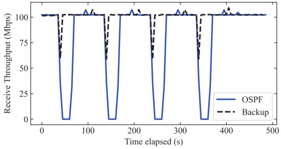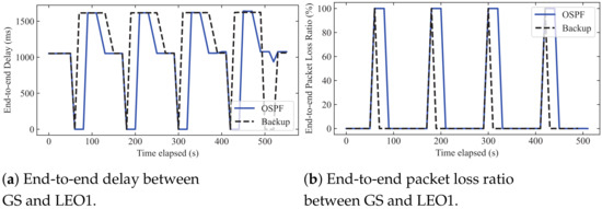 First, LEO1 continuously sends UDP packets to GS at a rate of 100 Mbps during this period. Figure 17, Figure 18a and Figure 19, respectively, give the receive throughput at GS, end-to-end link delay, and connection variation between LEO1 and GS in different routing strategies which show backup routing has a better link connectivity. When the transmission path has no burst interruption, the performance of OSPF and backup routing has no significant difference. When the link is interrupted, OSPF triggers the process of discovering the interruption and routing reconvergence as presented in Figure 18a. While the backup routing directly switches to the sub-optimal path, it switches back to the original optimal path when the interrupted link is restored.