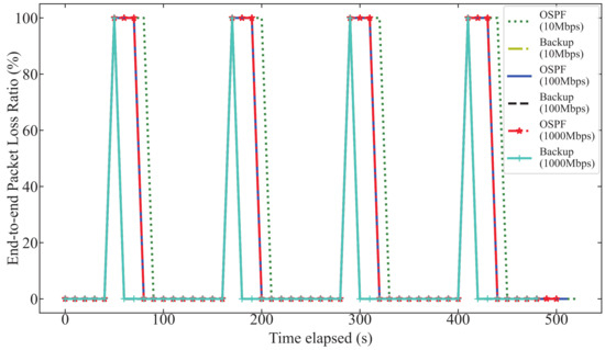 Then, the effect of bandwidth on the routing convergence time, which could be reflected by packet loss ratio, is taken into consideration. We configure the maximum bandwidth to 10 Mbps, 100 Mbps, and 1000 Mbps, respectively, while other link relationships and parameters remain unchanged. The end-to-end packet loss ratio in different maximum bandwidth is shown in Figure 20. The bandwidth variation has little effect on backup routing. However, it has a great impact on OSPF, and the impact increases with the decrease in bandwidth. Because OSPF monitors the link status through the Hello packet, less bandwidth increases the transmission time of the Hello packet. Backup routing selects the sub-optimal path directly, thus avoiding this problem.