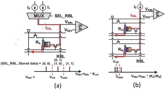 SOT-MRAM circuit for CIM []. (a) depicts an improved circuit with lower read and write current; the circuit is also more robust when executing CIM operations. (b) presents a conventional circuit that requires a larger current for reading and writing when performing CIM operations to achieve the same robustness as the improved circuit.