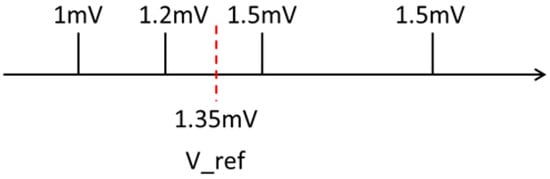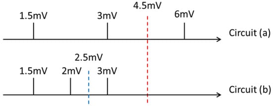 First, the voltage of the cell is measured. This voltage is used to determine whether the input current is I1 or I0, and the ratio of I1 to I0 is equivalent to the ratio of to . As indicated in Table 3, the voltage difference is larger, and the calculation can, thus, be more robust. Figure 2 reveals that, for the same read current, the voltage gap required by the circuit of Figure 1a is greater than Figure 1b, indicating that the circuit has a greater robustness. Therefore, low current and low power consumption can be used to set the same voltage threshold.