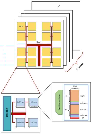 Figure 5 presents a memory circuit comprising eight banks. Each bank comprises 16 mats, and each mat has four cell arrays of size 16 × 1024 for a total of 1 megabyte. The control circuit can only control eight banks simultaneously. Each operation can run 16 parallel mats operations, and each mat has 4 cell arrays. In addition, each cell array can perform four 3 × 3 convolutions simultaneously; thus, the memory architecture can execute 64 convolutions in parallel.