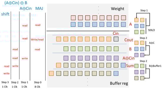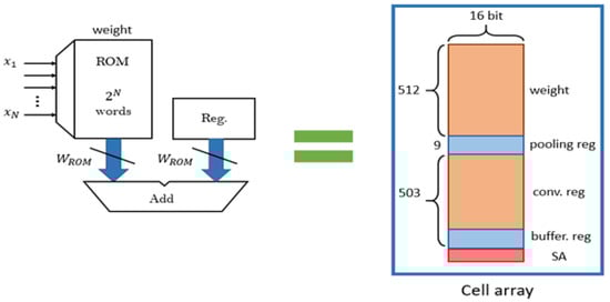 MRAM is nonvolatile memory, and its read speed is similar to that of DRAM; thus, MRAM is suitable as the storage unit for a DA architecture. To increase the efficiency of in-memory calculation execution and to achieve lower latency and read/write power consumption, the weighted memory and buffer register stored in the CIM are placed on the same cell array shown, as presented in Figure 7. In addition, these defined memory sizes can be changed because the entire memory space, not only one specific part of the memory, can complete CIM operations.