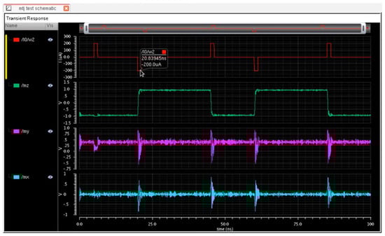 The SOT-MRAM model is built at the circuit level. The MRAM model used in our research is the same as that presented in []. That study’s authors provided the SOT-MRAM Verilog-A model file that is used to facilitate simulations and verifications of the real-world performance of MRAM memory. Figure 11 presents the simulation results of MRAM Verilog-A in Cadence Virtuoso.
