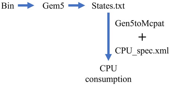 Gem5 [] is a modular discrete event-driven simulator for a full-system that combines the advantages of M5 and GEMS. M5 is a highly configurable simulation framework that supports a variety of ISAs and CPU models. In addition, GEMS complements the features of M5 by providing a detailed and flexible memory system, including multiple cache consistency protocols and interconnection models. It is a highly configurable architecture simulator that integrates multiple ISAs and multiple CPU models. In our experiment, we used a single-core Arm A9 CPU clocked at 2 Ghz as the CIM CPU for simulation analysis. Figure 13 presents the entire simulation process in Gem5. First, C code was compiled into a binary file, and Gem5 was then used to simulate the binary file and obtain a states.txt file containing data on the simulated CPU cycles and the read/write times of memory. Then, CPU power consumption could be obtained with the Mcpat tool.