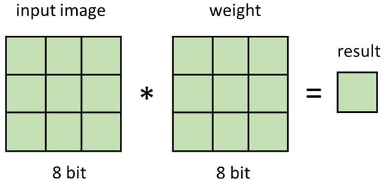 The error rate of visual recognition by CNNs declined from 28% in 2010 to 3% in 2016 to become better than the 5% error rate in manual (i.e., human) visual recognition []. CNNs have been integrated into embedded systems to solve image classification and pattern recognition problems. However, large CNNs may have millions of parameters and require up to tens of billions of operations to process an image frame []. Therefore, accelerating the convolution operation yields the greatest improvement in performance. Iterative processing of the CNN layers is a common design feature of CNN accelerators. However, the intermediate data are too large to fit on the chip’s cache, and accelerator designs must, thus, use off-chip memory to store intermediate data between layers after processing. Due to the computational requirements of Internet of Things (IoT) and artificial intelligence (AI) applications, the cost of moving data between the central processing unit (CPU) and memory is a key limiter of performance.