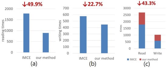 We analyzed the number of access times in reading, writing, and overall reading/writing separately; the results were then compared with those in previous IMCE studies. Figure 14 presents the convolution algorithm used for this comparison. The input image data and weight were both 8-bit. Figure 15 present three comparisons of reading and writing times. For reading times only, as presented in Figure 15a, we observed that our method is 49.9% faster that IMCE. As presented in Figure 15b, our method was 22.7% faster than IMCE in writing times. Finally, with regard to overall reading/writing times, as indicated in Figure 15c, our method was 43.3% faster than IMCE overall. This improvement was due to the use of the DA algorithm to substantially reduce the number of reads and, thus, reduce the power consumption during CIM by replacing multiplication with a lookup table.