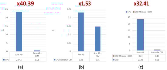 To determine whether the CIM architecture can effectively reduce computing power consumption, we used a non-CIM architecture and the CIM architecture to run the same NN as presented in Figure 16; this algorithm was also used in our experimental analysis. The main focus of our research is the ConV operation; therefore, the FC layer in the NN handled the CPU operation, and the CIM circuit architecture handled the ConV operation. Table 5 presents a comparison of the power consumption of the two architectures. Figure 17a shows the comparison of CPU power consumption. The difference is primarily because the convolution operation consumes the most power. In the CIM architecture, the convolution operation is moved to memory. Thus, the CPU does not perform the convolution operation, greatly reducing power consumption. Figure 17b illustrates the memory power consumption for comparison. CIM architecture can minimize the data transmission path and more greatly reduce the total memory power consumption. Moreover, because convolution has been moved to memory and also further reduced power consumption, the total read/write power consumption of the memory was lower. Figure 17c presents a comparison of the total power consumption, revealing that the CIM circuit architecture has lower overall power consumption.