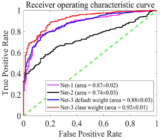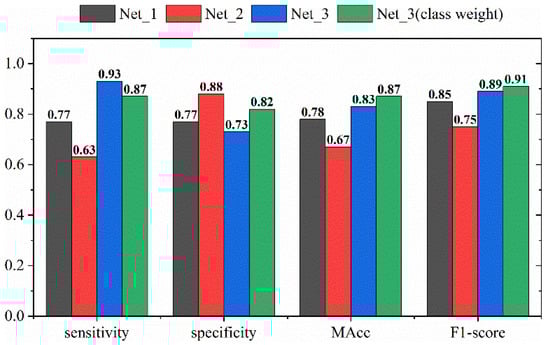 These performance evaluations of the three network structures are shown in Figure 3 and Figure 4. The performance of Net_1 was not so good; Net_2 produced the highest detection of true negative cases, with a specificity of 0.88; Net_3 provided the best overall balanced performance compared to the other two network architectures. In the training process of Net_3, we set class weights in the loss function to solve the problem of category imbalance.