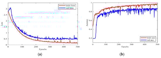 With the setting of the class weights, Net_3 provided the best overall performance compared to the default equal-weight loss function with respect to MAcc of 0.87, F1-score of 0.91 and AUC value of 0.92. Figure 5 shows the training and validation loss and accuracy vs. epoch curve of Net_3. As the number of iterations increases, the loss-function curve will gradually converge. In order to prevent overfitting, we set the number of iterations to 500. The training of the neural networks involved 10 runs. The final result is the average of these 10 runs.